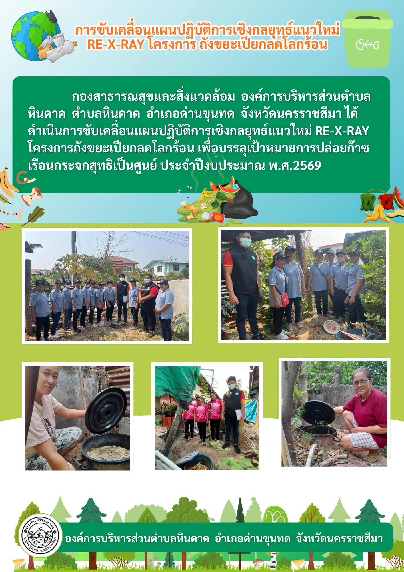 กองสาธารณสุขและสิ่งแวดล้อม องค์การบริหารส่วนตำบลหินดาด ตำบลหินดาด อำเภอด่านขุนทด จังหวัดนครราชสีมา ได้ดำเนินการขับเคลื่อนแผนปฏิบัติการเชิงกลยุทธ์แนวใหม่ RE-X-RAY โครงการถังขยะเปียกลดโลกร้อน เพื่อบรรลุเป้าหมายการปล่อยก๊าซเรือนกระจกสุทธิเป็นศูนย์ ประจำปีงบประมาณ พ.ศ.2569
