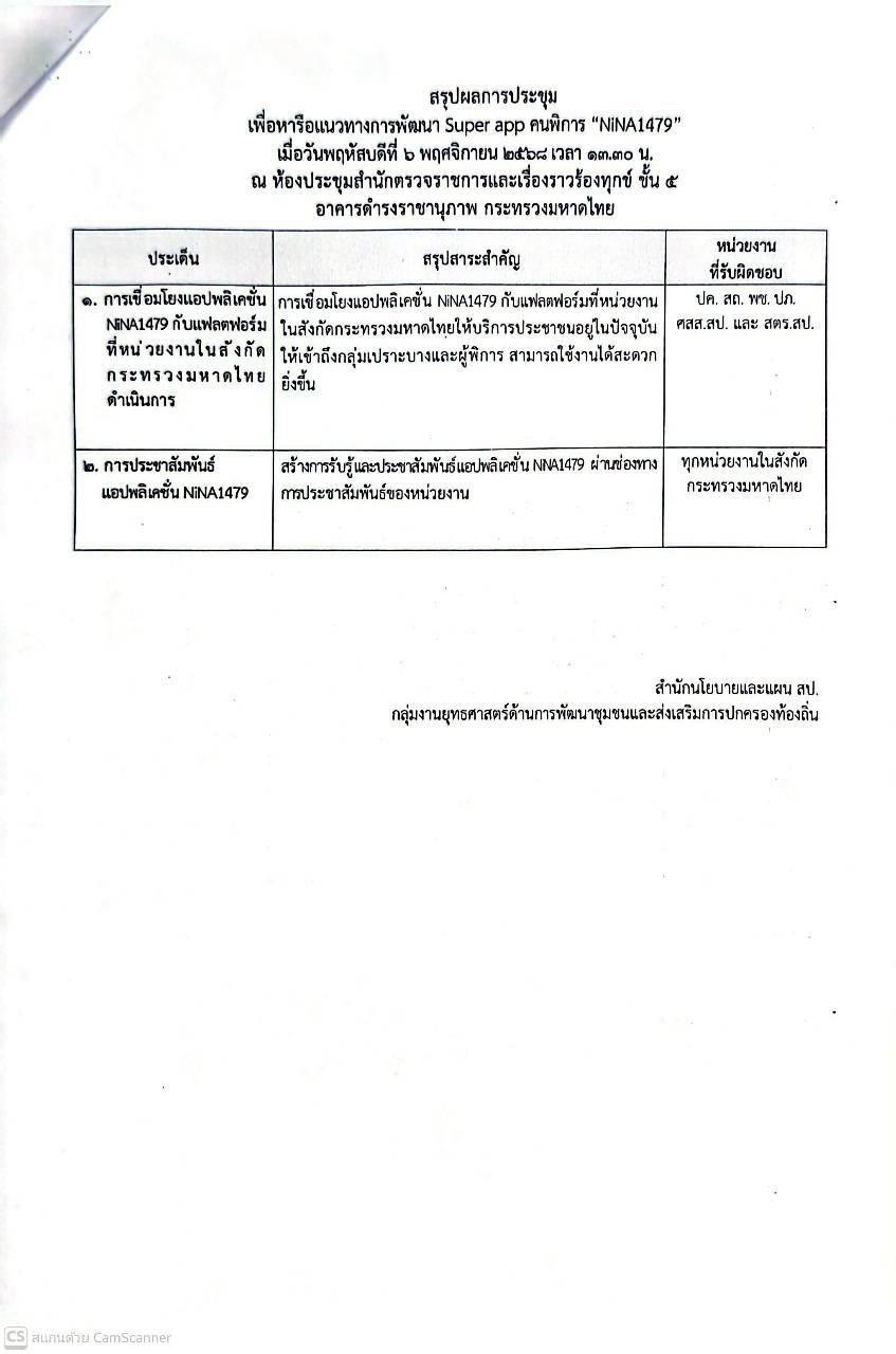 ด้วยกระทรวงมหาดไทย ได้ประชุมหารือร่วมกับมูลนิธิพระมหาไถ่เพื่อการพัฒนาคนพิการ ถึงแนวทางการพัฒนา Super app คนพิการ "NiNA1479" เมื่อวันพฤหัสบดีที่ ๖ พฤศจิกายน ๒๕๖๘ เวลา ๑๓.๓๐ น. ณ ห้องประชุมสํานักตรวจราชการและเรื่องราวร้องทุกข์ ชั้น ๕ อาคารดํารงราชานุภาพ กระทรวงมหาดไทย ซึ่งที่ประชุมได้ปรึกษาหารือแลกเปลี่ยนความคิดเห็นในการพัฒนาแอปพลิเคชัน NiNA1479 ให้เชื่อมโยงกับแพลตฟอร์มหรือแอปพลิเคชันที่หน่วยงานในสังกัดกระทรวงมหาดไทยให้บริการประชาชน อยู่ในปัจจุบัน และกระทรวงมหาดไทยจะช่วยสร้างการรับรู้และประชาสัมพันธ์แอปพลิเคขัน NiNA1479 ผ่านช่องทางการประชาสัมพันธ์ของหน่วยงานในสังกัดต่อไป
